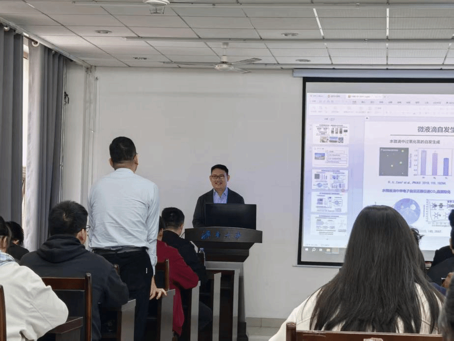 范凤茹教授作了题为“新型带电界面上的催化反应”的学术报告。他结合课题组近年来研究成果,针对带电界面体系电荷行为复杂、耦合机制不明确等挑战,重点介绍了在固/液接触起电、液/气微液滴及异质钯氢电催化三类典型界面上的系列研究进展。在固/液接触起电界面,基于机械作用诱导的界面电荷转移,实现了常温常压下过氧化氢的绿色合成与甲烷的选择性氧化;在液/气微液滴带电界面,利用其自发形成的强电场与独特微环境,发展了二氧化碳还原、氮气固定及多种自由基反应新途径;在异质钯氢电催化界面,通过调控Pd-H动态作用与界面储氢行为,揭示了晶格氢迁移与表界面反应之间的耦合机制。范教授系列工作阐明了不同带电界面上电荷行为与反应过程耦合的基本原理,为发展新型催化体系与绿色合成策略提供了新思路,并在小分子转化与能源化学中展现出应用潜力。