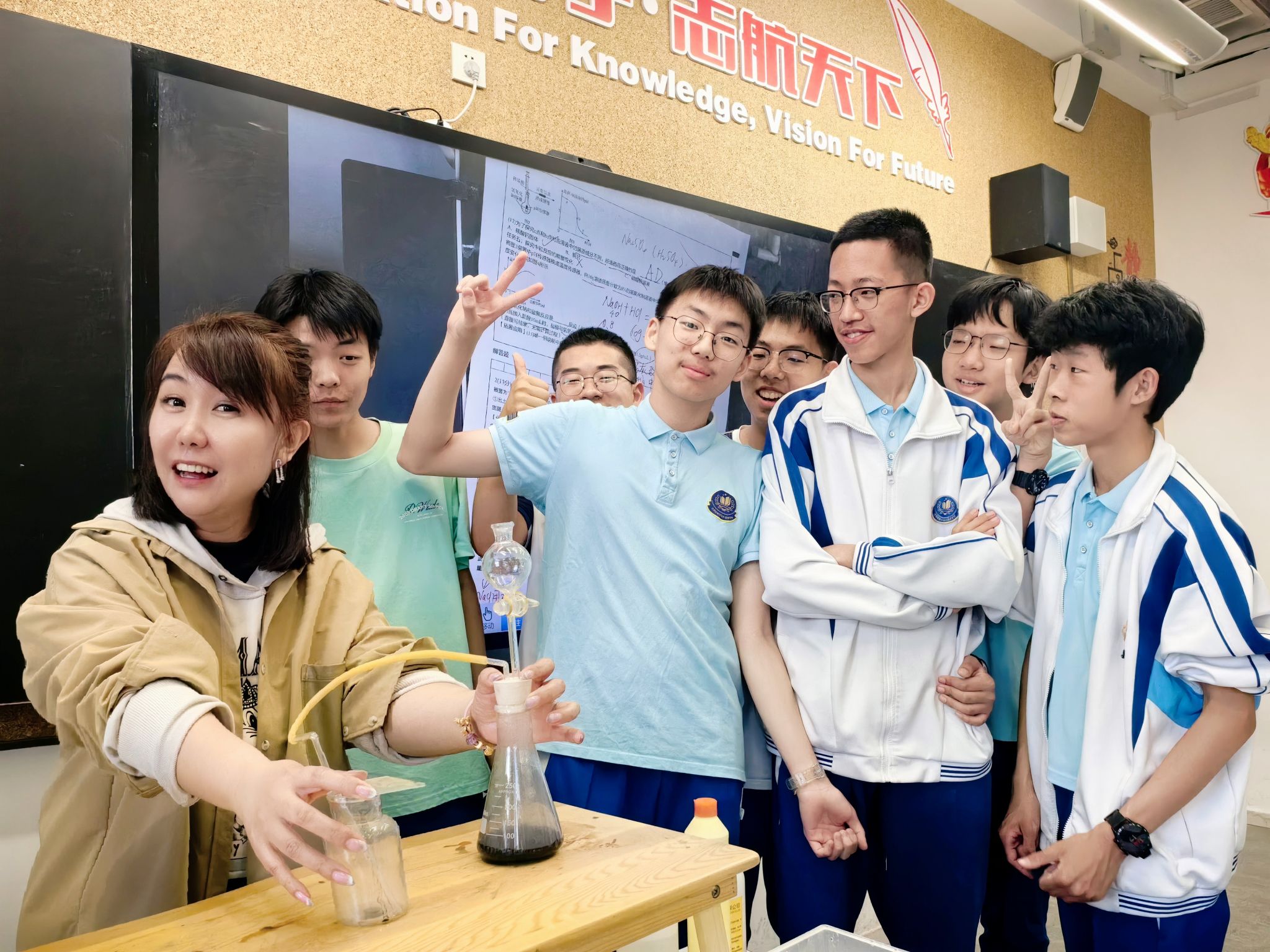 走进社会生活,同学们发现单靠一个学科的知识是解决不了所有问题的,应尝试与其他学科的融合发展,不断扩大“+”的内涵。所以,马老师主动联系本校物理、生物组一起进行“实验+”的联合开发。这也正契合了“中国教育现代化2035”推出的八大基本理念之——“注重融合发展”。科学学科的老师们在她的带领下,用“项目式学习”的方式带动学科融合,每一个项目从海报到宣传视频,从实践到总结都由理综工作室成员设计并实施。如此,马立霞老师引领下的化学及科学学习不断散发出一种独特的生命力!
