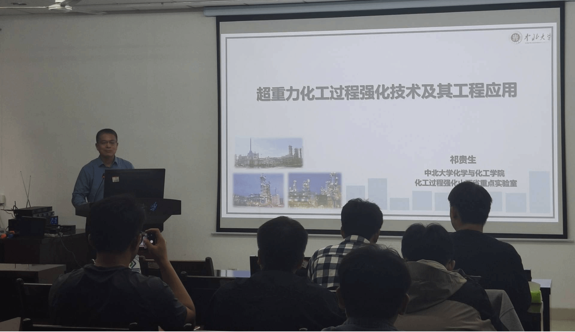 祁贵生教授作了题为“超重力化工过程强化技术及其工程应用”的学术报告。他首先从化工基本原理入手,系统阐述了超重力技术的核心概念、发展历程及其在工业中的基础应用价值,并深入浅出地解析了超重力场下的流体动力学、传质传热机制,强调了超重力技术在提升化工过程效率中的关键作用。随后祁贵生教授结合课题组近年来研究成果,重点介绍了超重力反应器的设计优化、催化机理研究及性能验证,以及超重力技术在煤化工、冶金、化肥等多个工业工程领域的经典应用案例;通过实验数据和模型模拟,展示了超重力技术在节能减排、资源高效利用方面的突破性进展,展望了其未来在智能化集成、绿色化工拓展等领域的发展方向。祁贵生教授的报告内容丰富、视角多维,为我校研究生、青年教师等青年学者和师生提供了前沿的科研思路和行业洞见。最后,祁贵生教授鼓励青年学者要加强跨学科合作,积极投身国产技术创新,将研究成果转化为实际应用,推动我国化工行业的自主创新与竞争力提升,应对全球化工安全与可持续发展的挑战。