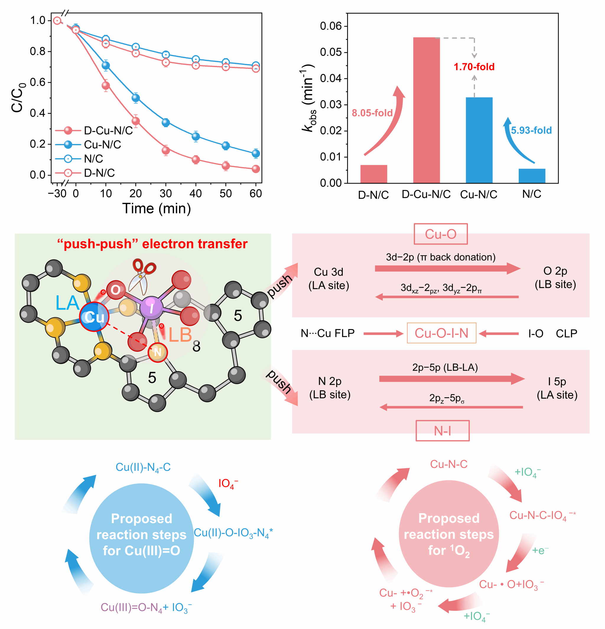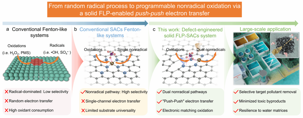 近日,365英国上市博士后王荣耀在材料领域国际顶级期刊《Advanced Functional Materials》上发表了题为“Defect-Engineered Solid Frustrated Lewis Pairs Direct Dual Nonradical Oxidation in Single-Atom Catalysis via Push-Push Electron Transfer”的研究论文。王荣耀博士为第一作者,英国上市公司官网365陈国柱教授与山东大学许醒教授为共同通讯作者。 高级氧化技术(AOPs)是降解水体中持久性有机污染物的有效手段,但传统基于自由基的反应路径往往存在选择性差、氧化剂利用率低等问题。非自由基氧化路径,如高价金属-氧物种(HVMOs)和单线态氧(1O2),因其高选择性和温和的反应特性,成为环境催化领域的研究热点。然而,如何在单一催化界面实现这两种路径的协同调控,仍然是一个重大挑战。 在本研究中,团队巧妙设计了一种缺陷调制的铜单原子催化剂(D-Cu-N/C),在碳基体中构建了空间分离、电子耦合的“固体受阻路易斯对”(FLP)。其中,Cu-N4作为路易斯酸位点,缺陷锚定的吡啶氮作为路易斯碱位点,形成独特的“推-推”电子接力机制。该结构能够协同活化高碘酸盐(PI),同步生成高价Cu(III)=O物种和1O2,实现了双通道非自由基氧化。